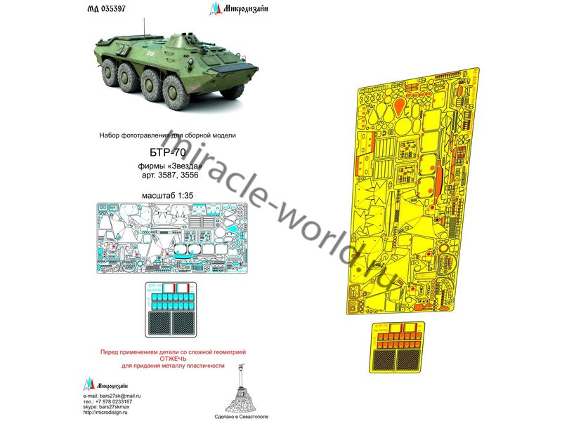 МД 035397 Набор фототравления на БТР-70 от Звезды. Масштаб 1:35. Материал: латунь 0,17 мм и 0,12 мм. Набор комплектуется 2 платами фототравления. Количество уникальных деталей: 154. Уровень сложности - высокий.