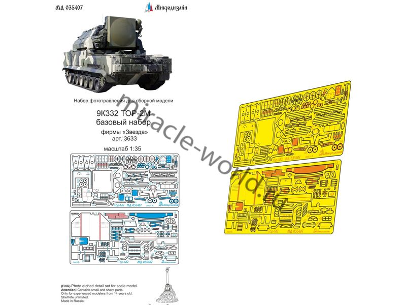 МД 035407 Базовый набор фототравления на 9К332 ТОР-2М от Звезды. Масштаб 1:35. Материал: латунь 0,15 мм, 0,2 мм. Набор комплектуется 2 платами фототравления и полноцветной инструкцией. Количество уникальных деталей: 141. Уровень сложности - средний.