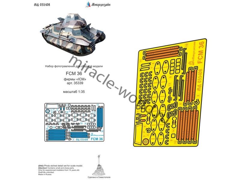 МД 035408 Набор фототравления на FCM 36 от ICM. Масштаб 1:35. Материал: латунь 0,15 мм, . Набор комплектуется платой фототравления и полноцветной инструкцией. Количество уникальных деталей: 18. Уровень сложности - средний.