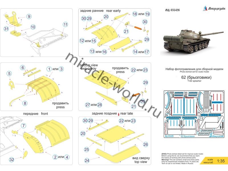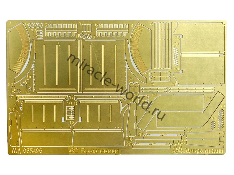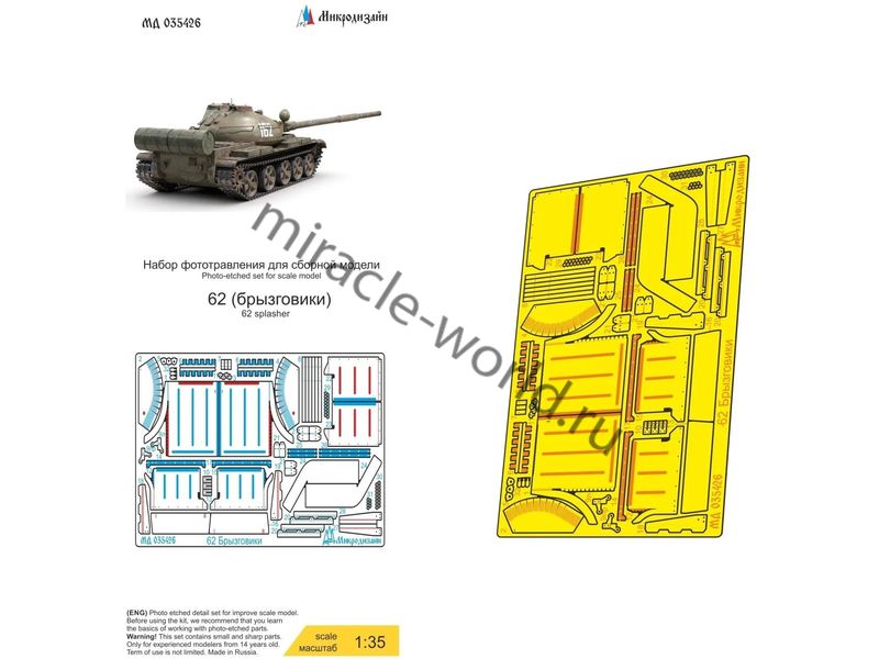 МД 035426 Набор фототравления брызговиков и грязевых щитков на Т-62 от Звезды. Масштаб 1:35. Материал: латунь 0,15 мм. Набор комплектуется платой фототравления и полноцветной инструкцией. Количество уникальных деталей: 31. Уровень сложности - средний.