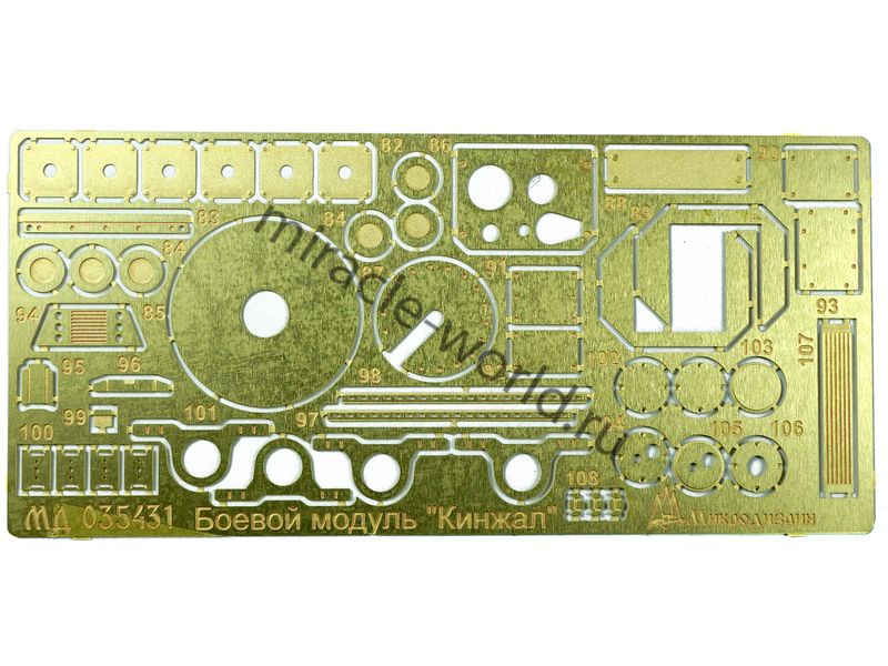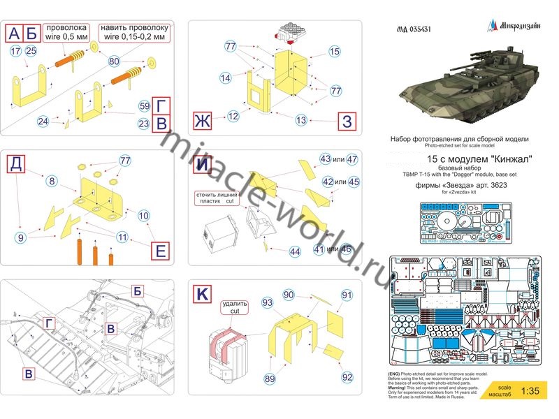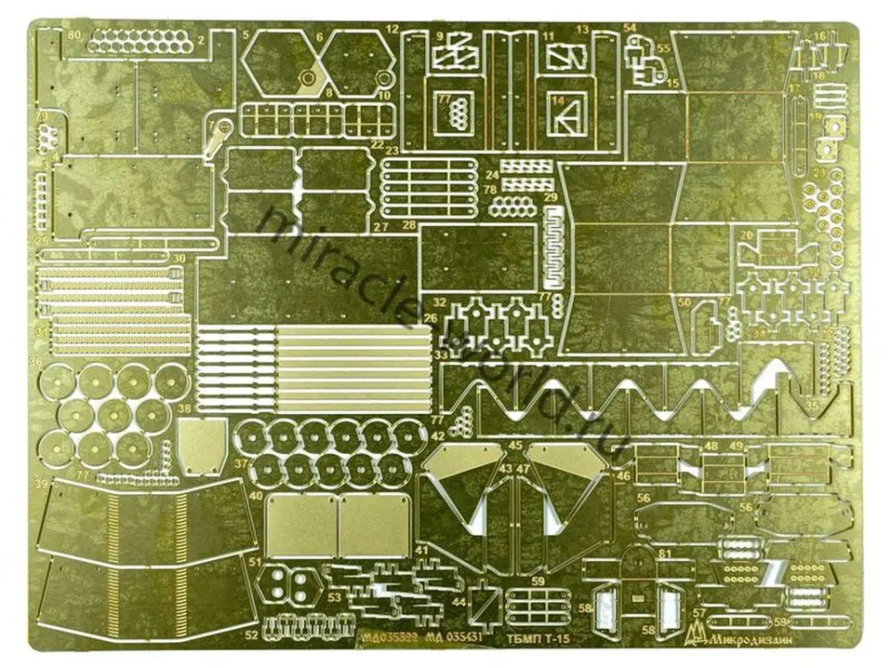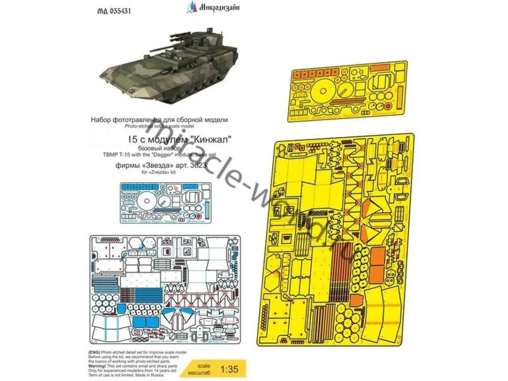 МД 035431 Фототравления базового набора на Т-15 с 57-мм пушкой БМ "Кинжал" от Звезды. Масштаб 1:35. Материал: латунь 0,12 мм, 0,17 мм. Набор комплектуется 2 платами фототравления и цветной инструкцией. Количество уникальных деталей: 108. Уровень сложности - средний.