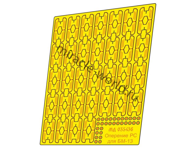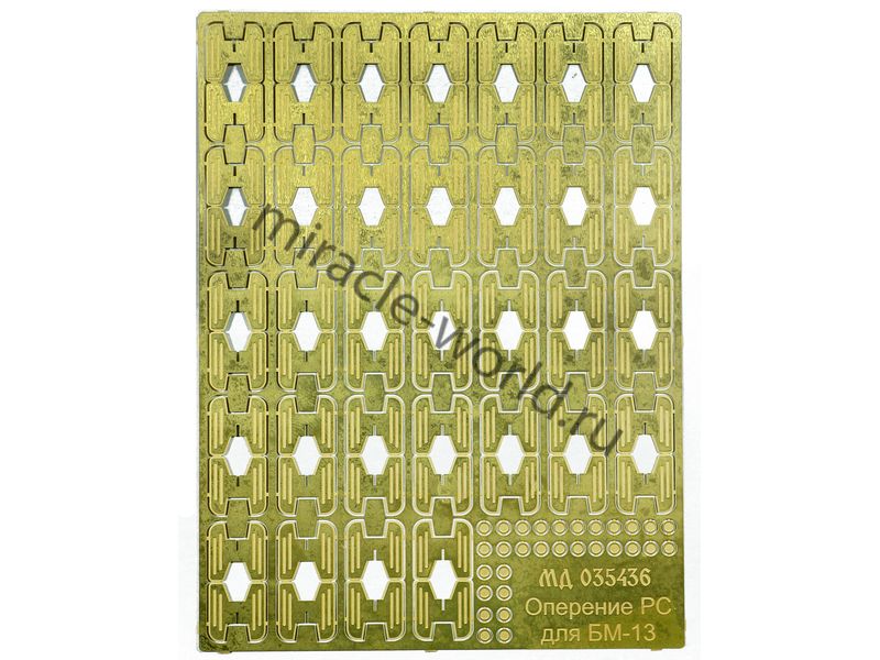 МД 035436 Набор фототравления оперения ракет для БМ-13 (все выпускаемые модели). Масштаб 1:35. Материал: латунь 0,2 мм. Набор комплектуется платой фототравления. В наборе оперение для шестнадцати 132-мм рективных снарядов М-13. Уровень сложности - начальный.