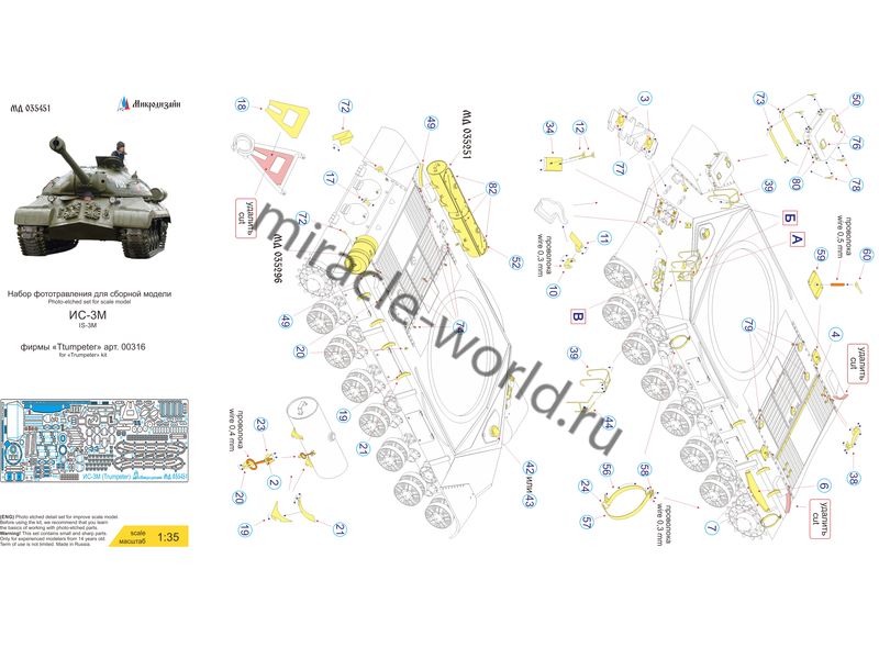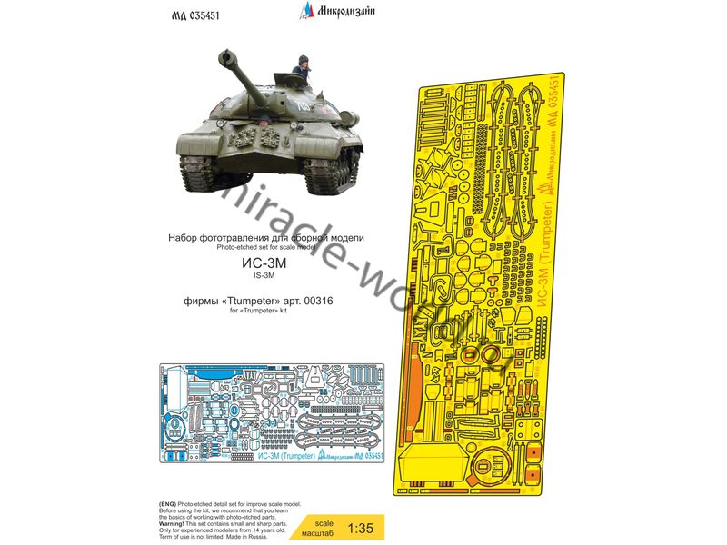 МД 035451 Набор фототравления на ИС-3М от Trumpeter. Масштаб 1:35. Материал: латунь 0,17 мм. Набор комплектуется платой фототравления и цветной инструкцией. Количество уникальных деталей: 60. Уровень сложности - средний.
