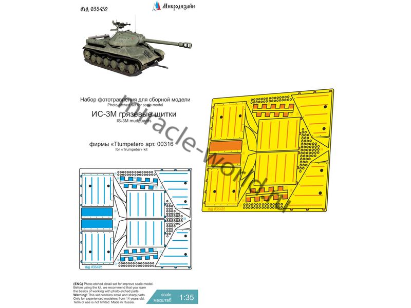 МД 035452 Набор фототравления грязевых щитков на ИС-3М от Trumpeter. Масштаб 1:35. Материал: латунь 0,15 мм. Набор комплектуется платой фототравления и цветной инструкцией. Количество уникальных деталей: 10. Уровень сложности - средний.