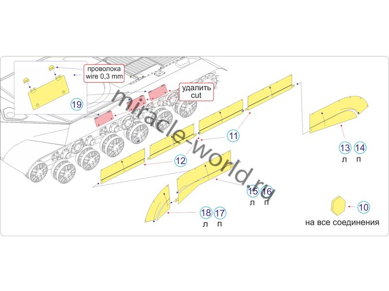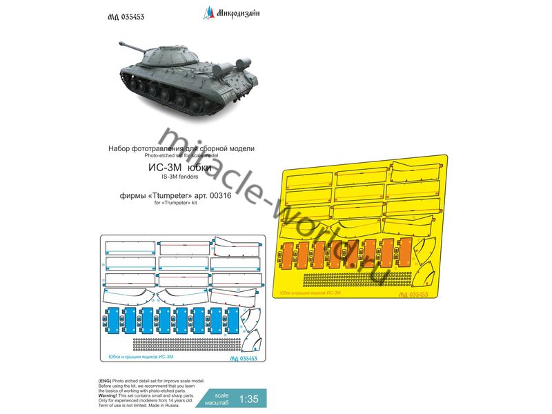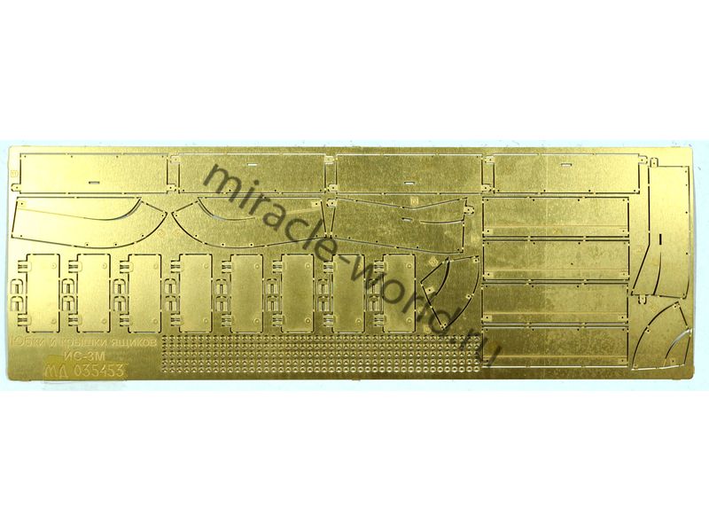МД 035453 Набор фототравления пылевых юбок на ИС-3М от Trumpeter. Масштаб 1:35. Материал: латунь 0,17 мм. Набор комплектуется платой фототравления и цветной инструкцией. Количество уникальных деталей: 19. Уровень сложности - средний.