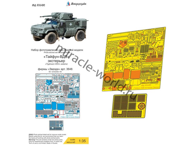 МД 035492 Набор фототравления экстерьера на "Тайфун-ВДВ" от Звезды. Масштаб 1:35. Материал: латунь 0,15 мм. Набор комплектуется 2 платами фототравления и цветной инструкцией. Количество уникальных деталей: 107 шт. Уровень сложности - средний.