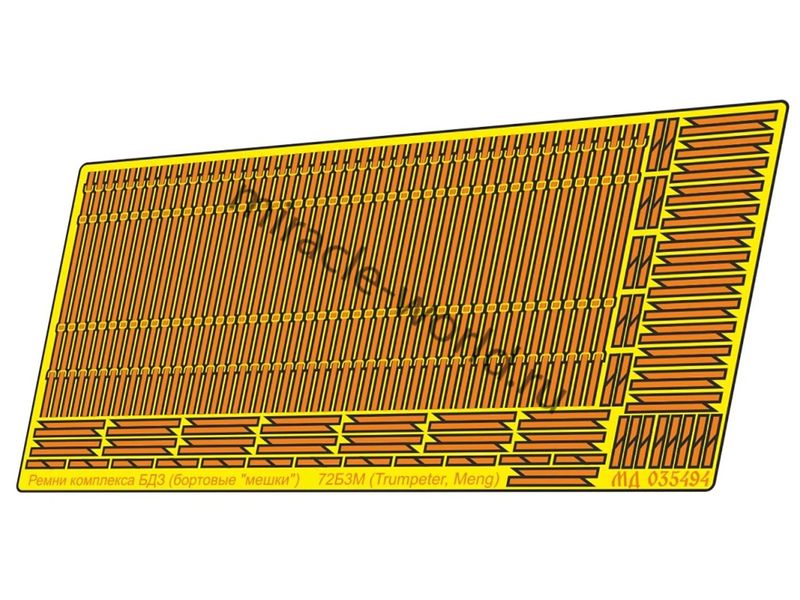 МД 035494 Набор фототравления ремней комплекса ДЗ "ЭРА" (бортовые "мешки") Т-72Б3М для моделей Trumpeter, Meng. Масштаб 1:35. Набор комплектуется платой фототравления. Количество ремней: 48 комплектов. Уровень сложности - начальный.