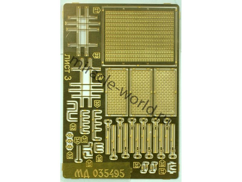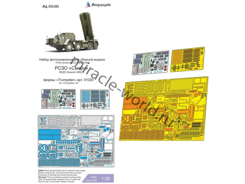 МД 035495 Набор фототравления на РСЗО "Смерч" от Trumpeter. Масштаб 1:35. Материал: латунь 0,15 мм. Набор комплектуется 3 платами фототравления (в том числе цветная плата приборных досок) и цветной инструкцией. Количество уникальных деталей: 153 шт. Уровень сложности - высокий.