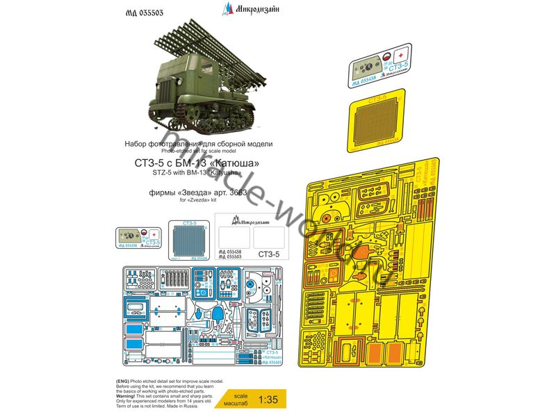 МД 035503 Набор фототравления на СТЗ-5 с БМ-13 "Катюша" от Звезды. Масштаб 1:35. Материал: латунь 0,15 мм. Набор комплектуется 3 платами фототравления (в том числе цветной объемной платой приборных досок). Количество уникальных деталей: 64. Уровень сложности - средний.