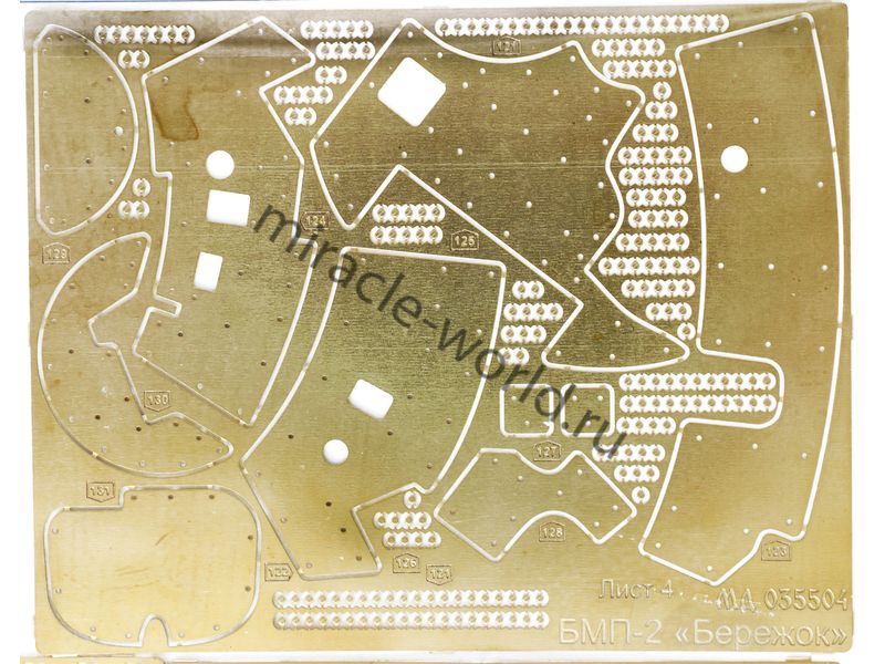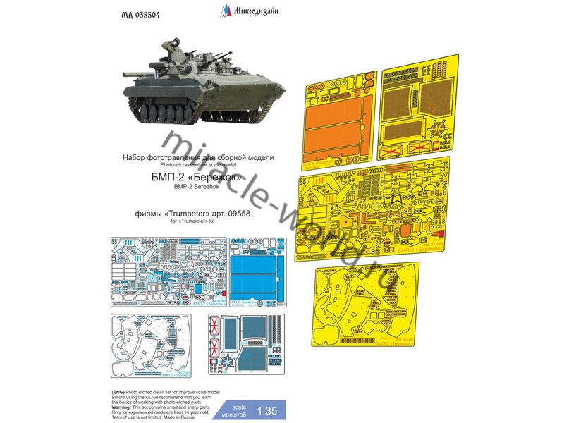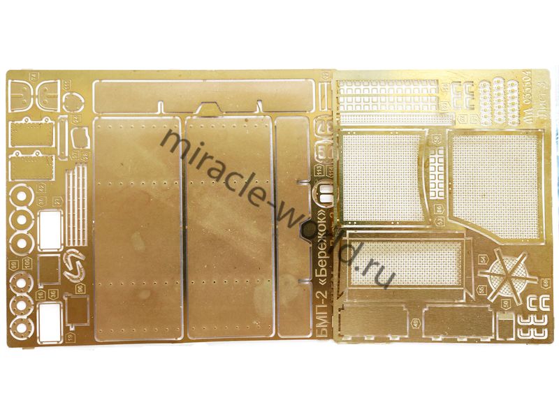 МД 035504 Набор фототравления на БМП-2 с БМ "Бережок" от Trumpeter. Масштаб 1:35. Материал: латунь 0,15 мм и 0,2 мм. Набор комплектуется 4 платами фототравления и цветной инструкцией. Количество уникальных деталей: 131 шт. Уровень сложности - средний.