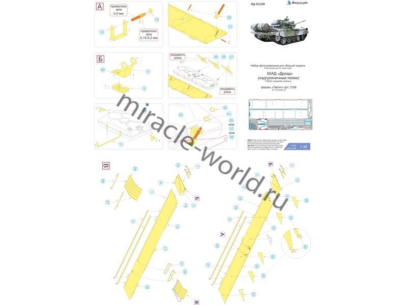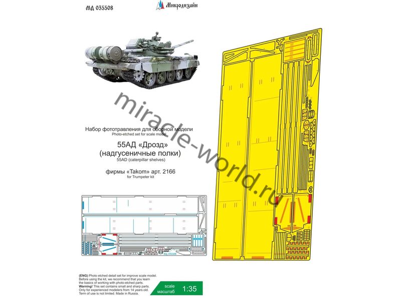 МД 035508 Набор фототравления надгусеничных полок на Танк тип 55АД "Дрозд" от Takom. Масштаб 1:35. Материал: латунь 0,2 мм. Набор комплектуется платой фототравления и цветной инструкцией. Количество уникальных деталей: 31 шт. Уровень сложности - средний.