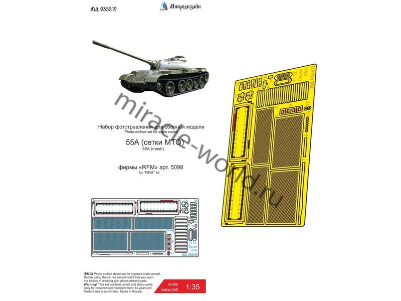 МД 035512 Набор фототравления сеток МТО на Танк тип 55 от RFM (все модификации). Масштаб 1:35. Материал: латунь 0,15 мм. Набор комплектуется платой фототравления и цветной инструкцией. Количество уникальных деталей: 12 шт. Уровень сложности - средний.