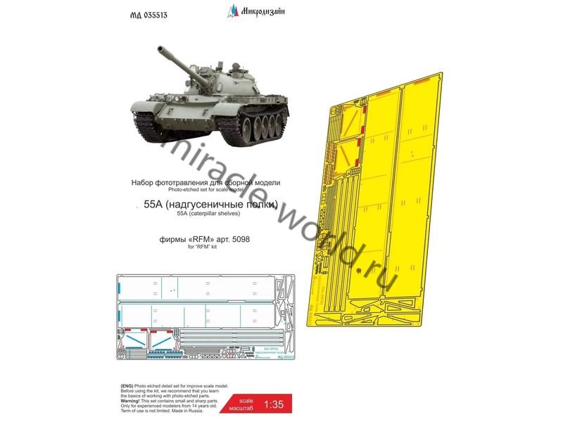 МД 035513 Набор фототравления надгусеничных полок на Танк тип 55А от RFM. Масштаб 1:35. Материал: латунь 0,2 мм. Набор комплектуется платой фототравления и цветной инструкцией. Количество уникальных деталей: 42 шт. Уровень сложности - средний.