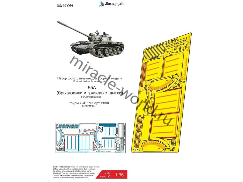 МД 035514 Набор фототравления грязевых щитков и брызговиков на Танк тип 55А от RFM. Масштаб 1:35. Материал: латунь 0,15 мм. Набор комплектуется платой фототравления и цветной инструкцией. Количество уникальных деталей: 25 шт. Уровень сложности - средний.