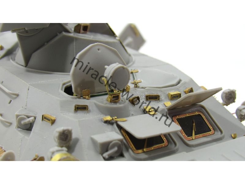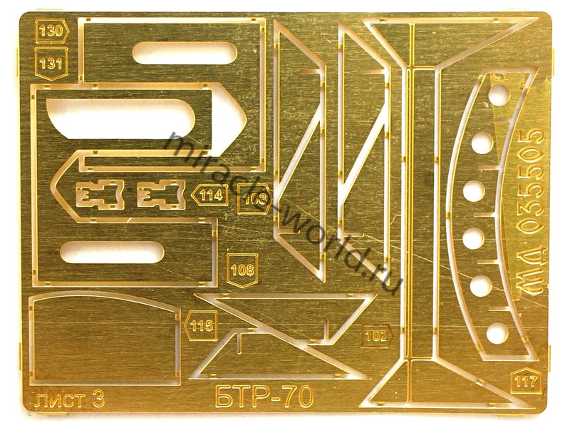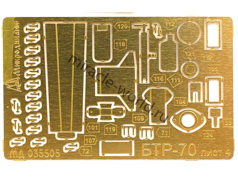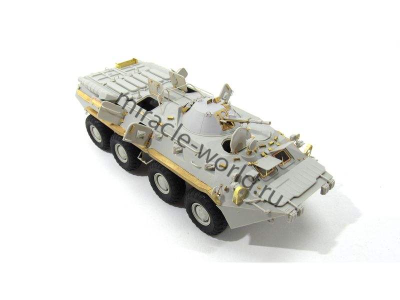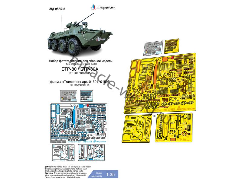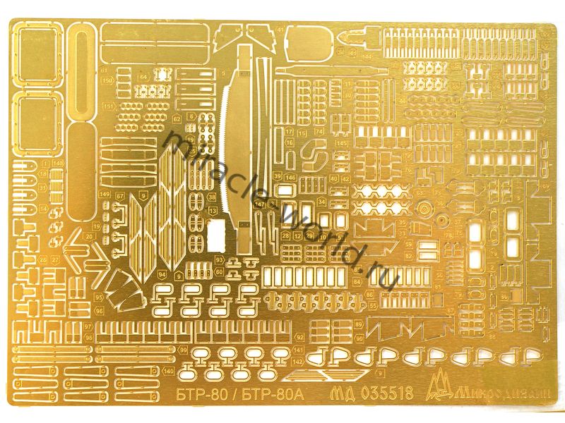 МД 035518 Набор фототравления на БТР-80 / БТР-80А от Trumpeter. Масштаб 1:35. Материал: латунь 0,15 мм. Набор комплектуется 5 платами фототравления (в том числе цветная плата приборных досок) и цветной инструкцией. Количество уникальных деталей: 141 шт. Уровень сложности - средний.