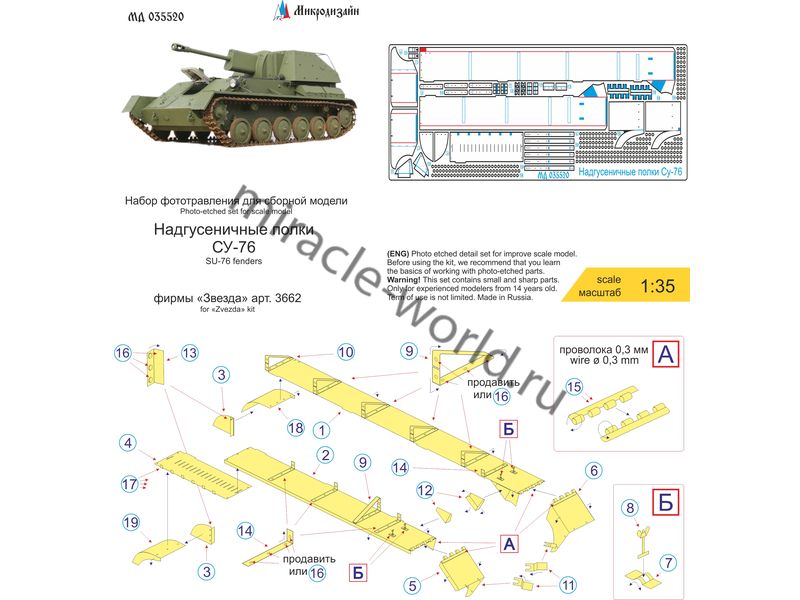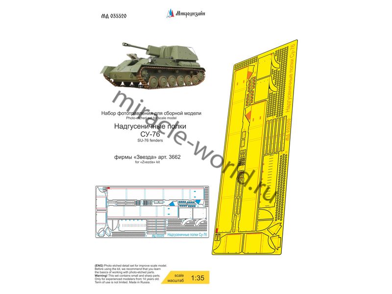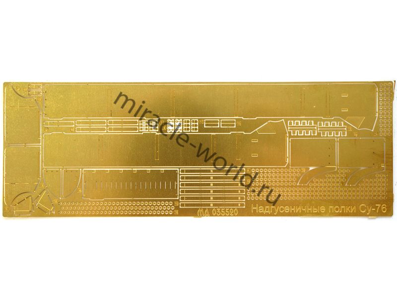 МД 035520 Набор фототравления надгусеничных полок на Су-76 от Звезды. Масштаб 1:35. Материал: латунь 0,2 мм. Набор комплектуется платой фототравления и цветной инструкцией. Количество уникальных деталей: 19 шт. Уровень сложности - средний.