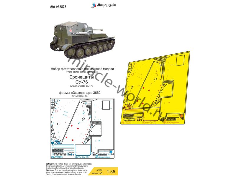 МД 035523 Набор фототравления щитов боевого отделения на СУ-76 от Звезды. Масштаб 1:35. Материал: латунь 0,3 мм. Набор комплектуется платой фототравления и цветной инструкцией. Количество уникальных деталей: 18 шт. Уровень сложности - средний.