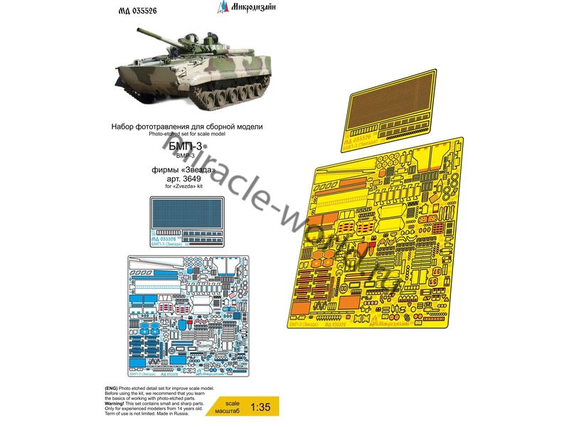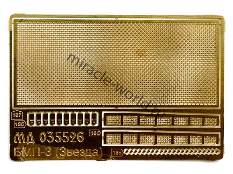 МД 035526 Набор фототравления на БМП-3 от Звезды. Масштаб 1:35. Материал: латунь 0,15 мм. Набор комплектуется 2 платами фототравления и цветной инструкцией. Количество уникальных деталей: 173 шт. Уровень сложности - средний.