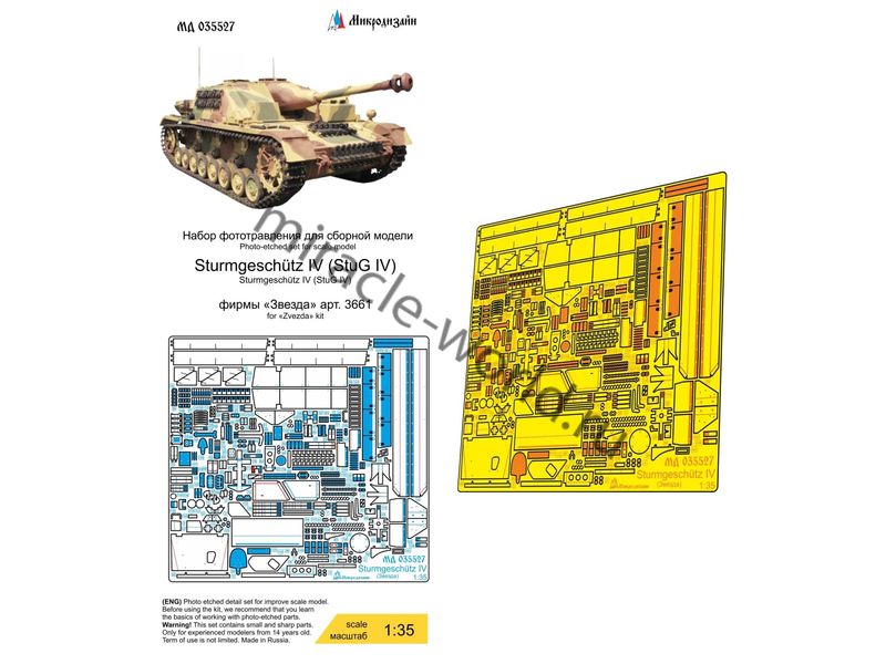МД 035527 Набор фототравления на Sturmgeschütz IV от Звезды. Масштаб 1:35. Материал: латунь 0,15 мм. Набор комплектуется платой фототравления и цветной инструкцией. Количество уникальных деталей: 129 шт. Уровень сложности - средний.