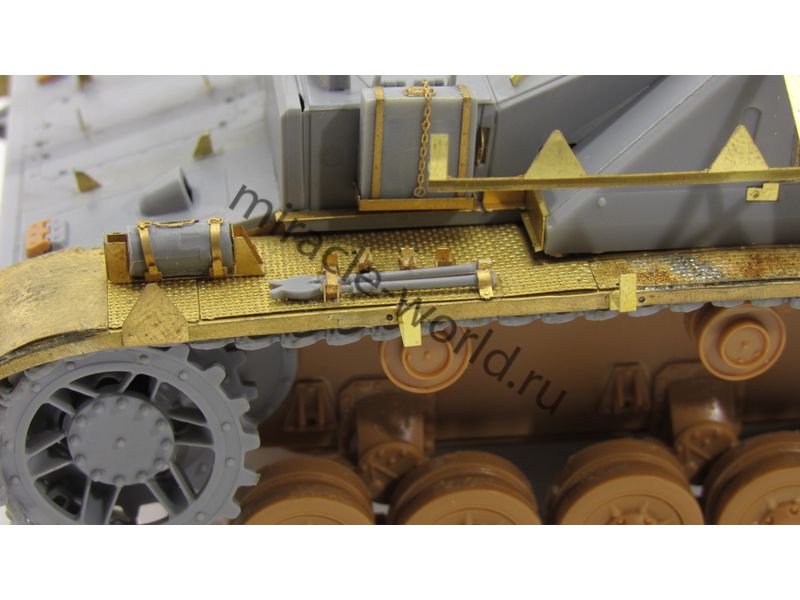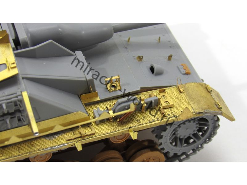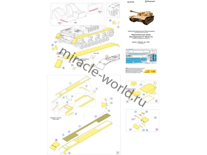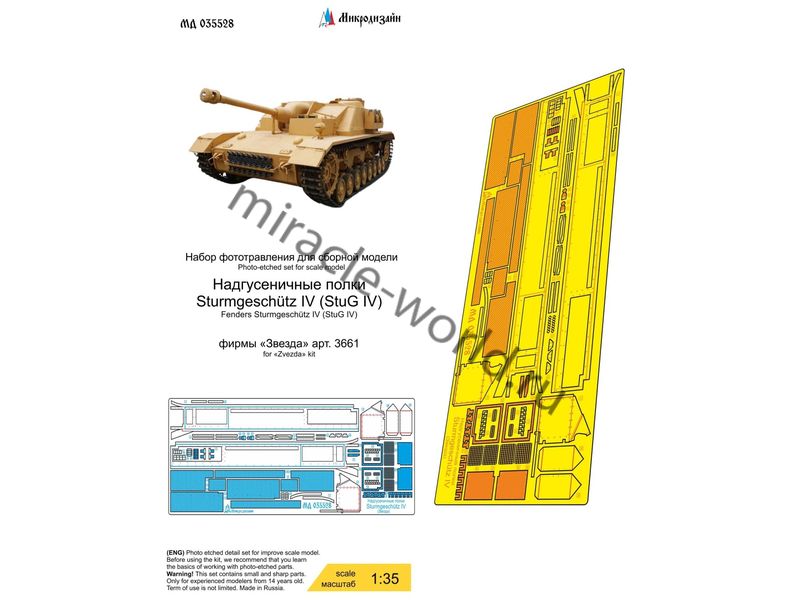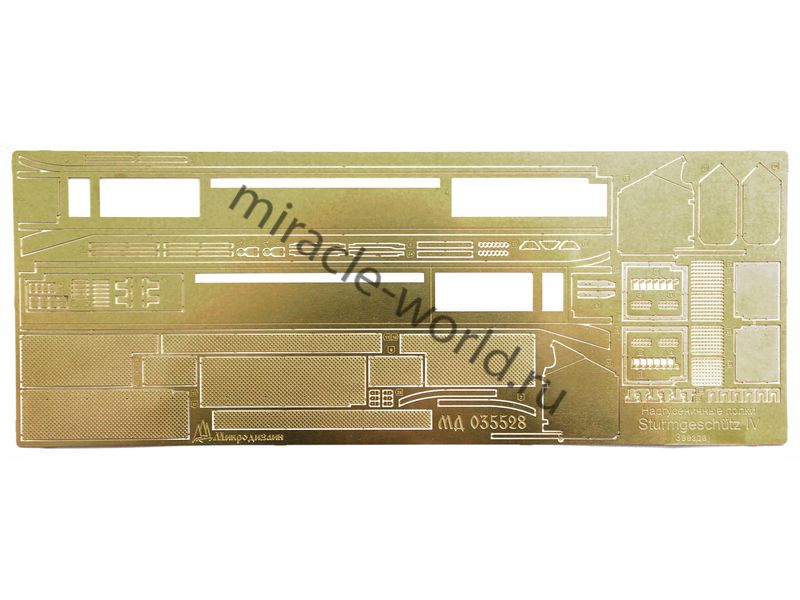 МД 035528 Набор фототравления надгусеничных полок на Sturmgeschütz IV от Звезды. Масштаб 1:35. Материал: латунь 0,2 мм. Набор комплектуется платой фототравления и цветной инструкцией. Количество уникальных деталей: 33 шт. Уровень сложности - средний.