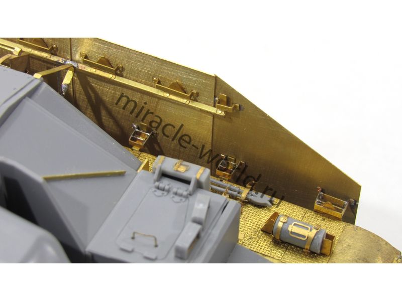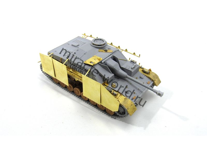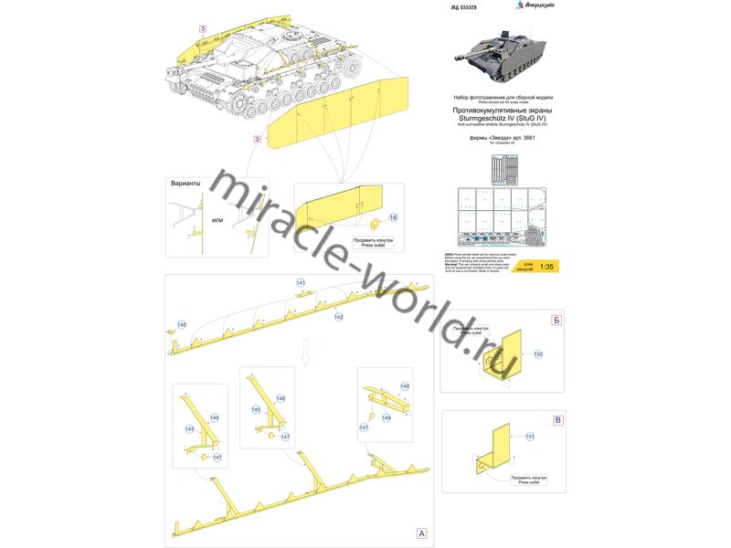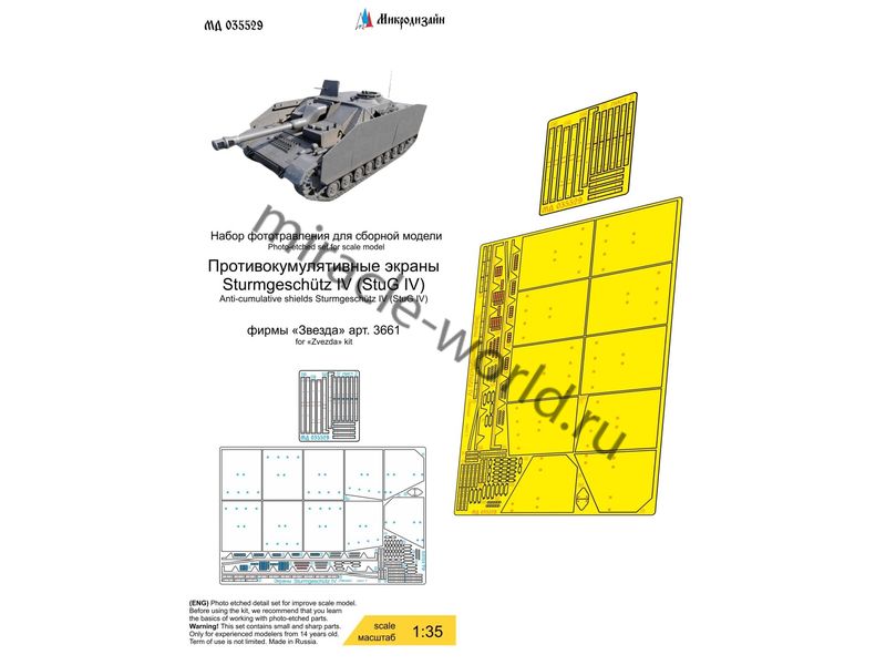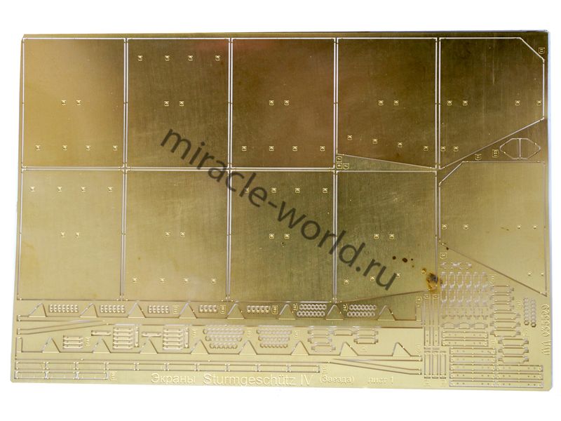 МД 035529 Набор фототравления противокумулятивных экранов на Sturmgeschütz IV от Звезды. Масштаб 1:35. Материал: латунь 0,2 мм. Набор комплектуется 2 платами фототравления и цветной инструкцией. Количество уникальных деталей: 28 шт. Уровень сложности - средний
