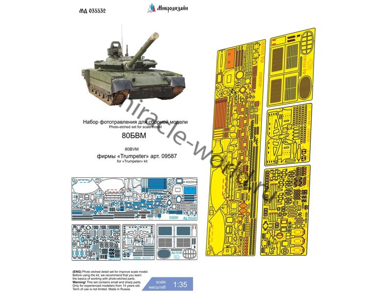 Микродизайн 035532 Базовый набор фототравления на Танк 80БВМ от Trumpeter. Масштаб 1:35. Материал: латунь 0,15 мм, 0,2 мм, 0,3 мм. Набор комплектуется 4 платами фототравления и цветной инструкцией. Количество уникальных деталей: 169 шт. Уровень сложности - средний.