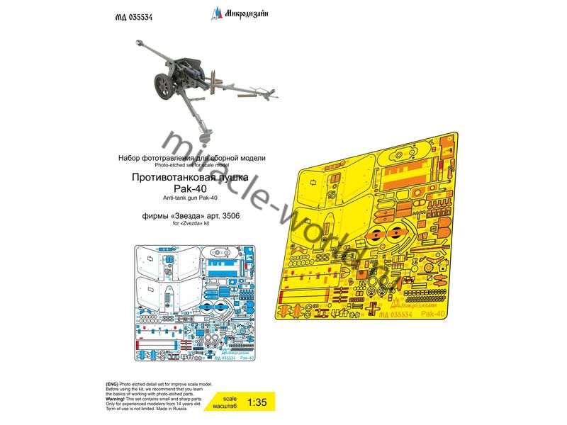 Микродизайн 035534 Набор фототравления для противотанковой пушки Pak-40 от Звезды. Масштаб 1:35. Материал: латунь 0,15 мм. Набор комплектуется платой фототравления и цветной инструкцией. Количество уникальных деталей: 106 шт. Уровень сложности - средний.
