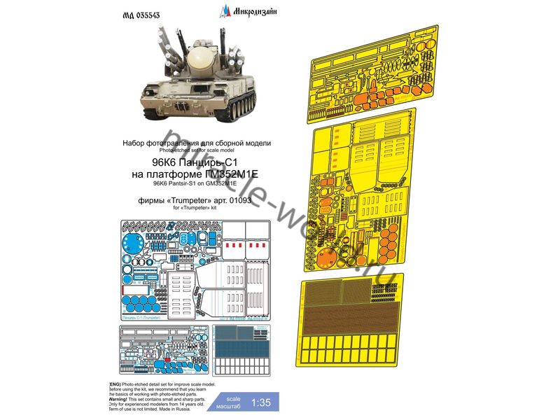 Микродизайн 035543 Набор фототравления 96К6 Панцирь-С1 на платформе ГМ352М1Е от Trumpeter. Масштаб 1:35. Материал: латунь 0,15 мм. Набор комплектуется 3 платами фототравления и цветной инструкцией. Количество уникальных деталей: 147 шт. Уровень сложности - высокий