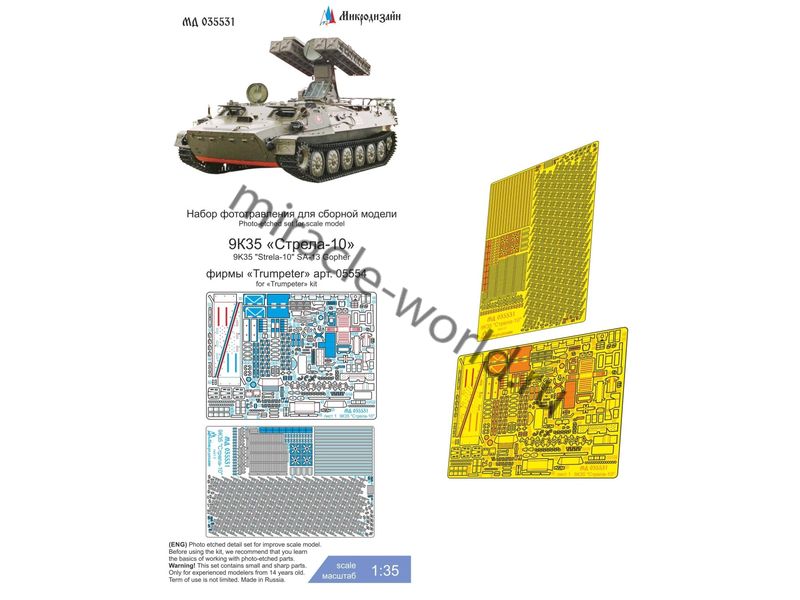 Микродизайн МД 035531 Набор фототравления 9К35 ЗРК "Стрела-10" от Trumpeter. Масштаб 1:35. Материал: латунь 0,15 мм. Набор комплектуется 2 платами фототравления и цветной инструкцией. Количество уникальных деталей: 122 шт. Уровень сложности - средний.