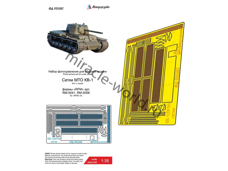 Микродизайн 035567 Набор фототравления сеток МТО на КВ-1 от RFM. Масштаб 1:35. Материал: латунь 0,15 мм. Набор комплектуется платой фототравления и цветной инструкцией. Количество уникальных деталей: 11 шт. Уровень сложности - средний.