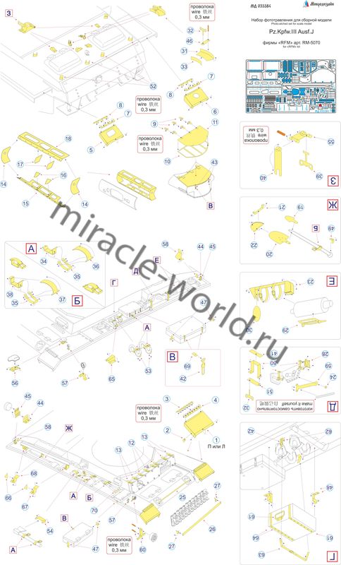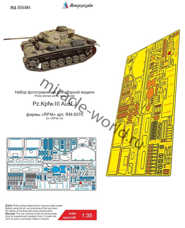 Микродизайн 035584 Набор фототравления на Pz.Kpfw.III Ausf.J от RFM. Масштаб 1:35. Материал: латунь 0,15 мм. Набор комплектуется платой фототравления и цветной инструкцией. Количество уникальных деталей: 71 шт. Уровень сложности - средний