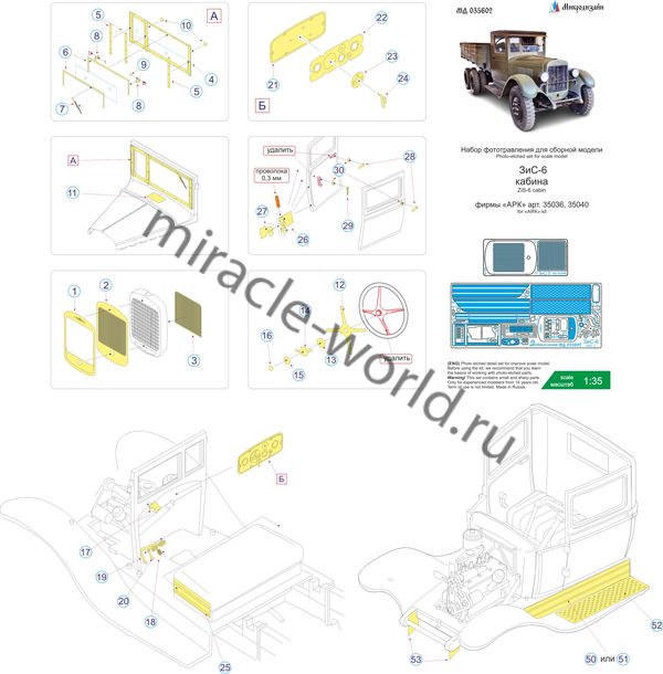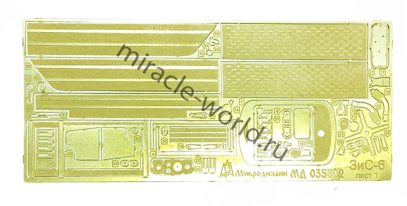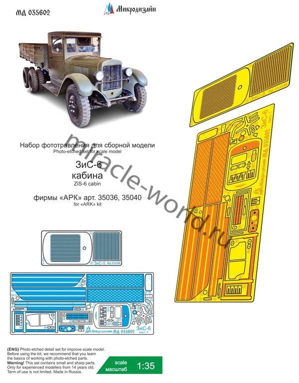 Микродизайн 035602 Набор фототравления кабины для ЗиС-6 от АРК. Масштаб 1:35. Материал: латунь 015 мм. Набор комплектуется 2 платами фототравления и цветной инструкцией. Количество уникальных деталей: 33 шт. Уровень сложности - средний