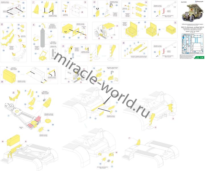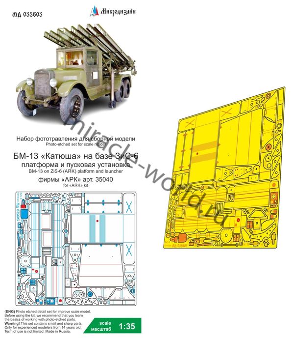 Микродизайн 035603 Набор фототравления платформы и пусковой установки БМ-13 на базе ЗиС-6 от АРК. Масштаб 1:35. Материал: латунь 015 мм. Набор комплектуется платой фототравления и цветной инструкцией. Количество уникальных деталей: 56 шт. Уровень сложности - средний.