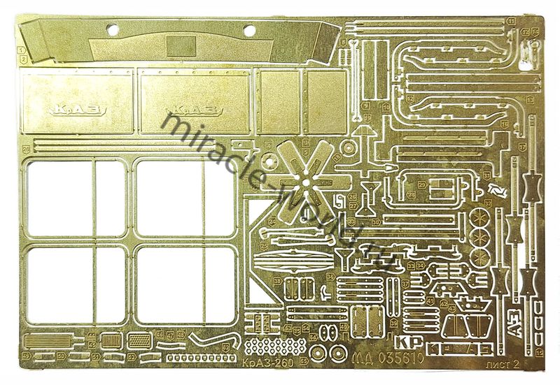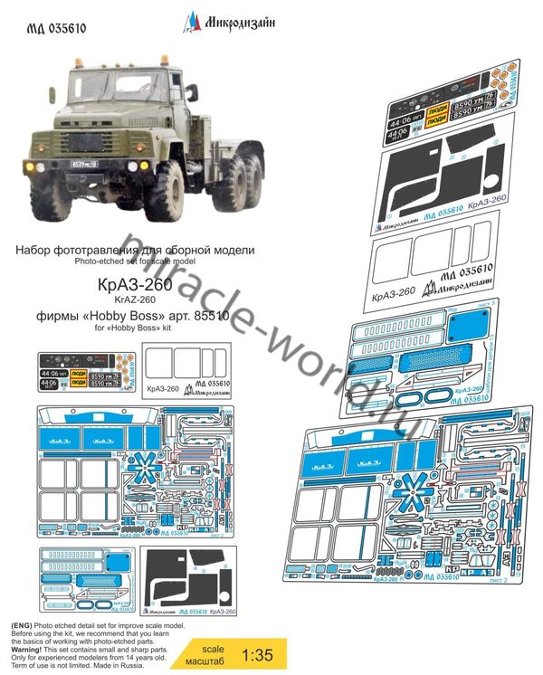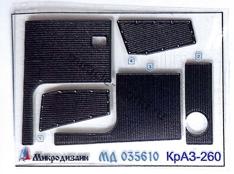 Микродизайн 035610 Набор фототравления на КрАЗ-260 от Hobby Boss. Масштаб 1:35. Материал: латунь 0,15 мм и 0,2 мм. Набор комплектуется 3 платами фототравления (в том числе цветной объёмной приборной доской), объёмными виниловыми ковриками и цветной инструкцией. Количество уникальных деталей: 63 шт. Уровень сложности - средний.