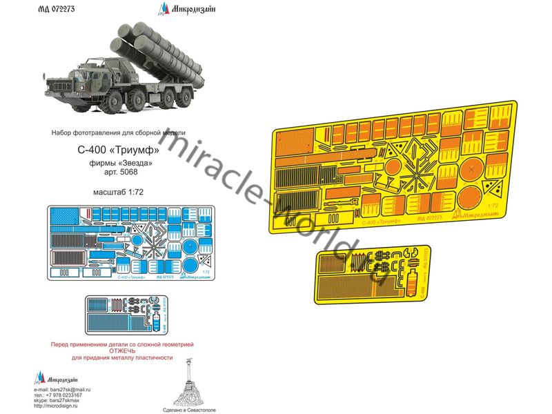МД 072273 Набор фототравления на С-400 от Звезды. Масштаб 1:72. Набор комплектуется 2 платами фототравления и цветной инструкцией. Количество уникальных деталей: 52 шт. Уровень сложности - средний.