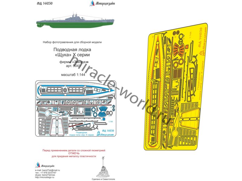 МД 144230 Набор фототравления на ПЛ "Щука X серии от Звезды. Масштаб 1:144. Материал: латунь 0,15 мм. Набор комплектуется пластиной фототравления и полноцветной инструкцией. Количество уникальных деталей 44. Уровень сложности: средний.