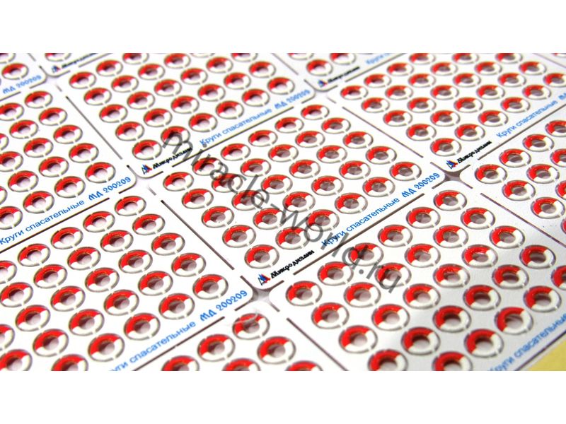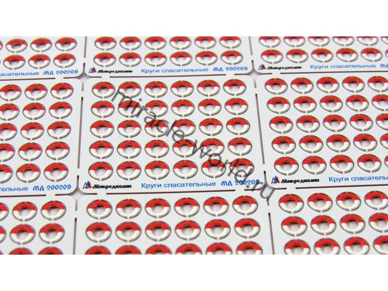 МД 200209 Набор объемного двустороннего цветного фототравления спасательных кругов эпохи Российского Императорского флота и СССР. Масштаб 1:200. Материал: латунь 0,15 мм, объемный цветной фотополимер. Количество 30 шт. Круги выполнены по новой уникальной технологии, позволяюшей создавать двусторонние объемные цветные предметы. Уровень сложности - начальный.