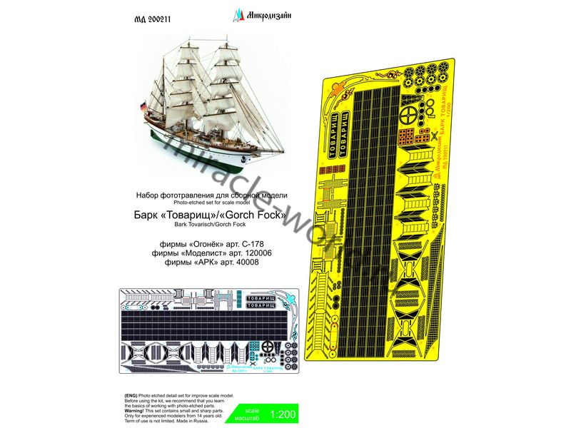Микродизайн 200211 Барк "Товарищ" / "Gorch Fock" (Огонек, АРК, Моделист) /набор фототравления/ 1/200