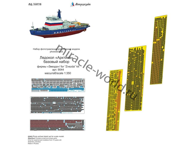МД 350218 Набор фототравления на ледокол "Арктика" (базовый) от Звезды. Масштаб 1:350. Материал: латунь 0,15 мм. Набор комплектуется 3 пластинами фототравления и цветной инструкцией. В набор входит все леерное ограждение, трапы, скоб-трапы, двери, реи. Уровень сложности: высокий.