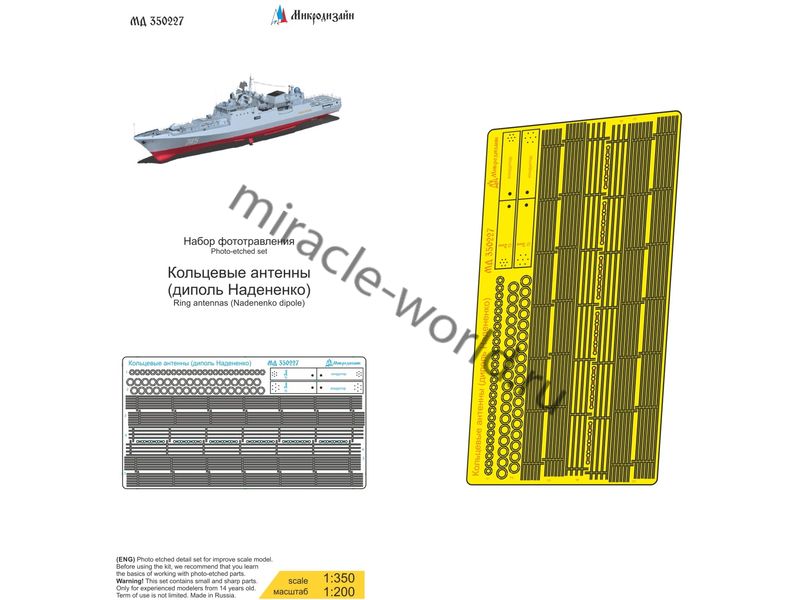 МД 350227 Набор фототравления кольцевых антенн (диполь Надененко). Масштаб 1:350 и 1:200. Материал: латунь 0,15 мм. Набор комплектуется 2 пластинами фототравления и цветной инструкцией. Количество уникальных деталей 5. Уровень сложности - начальный