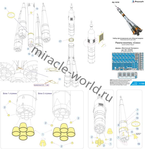 Микродизайн 144246 Набор фототравления для модели ракета-носителя "Союз" от Восточного Экспресса. Масштаб 1:144. Материал: латунь 0,15 мм. Количество уникальных деталей: 18 шт. Набор комплектуется платой фототравления и цветной инструкцией