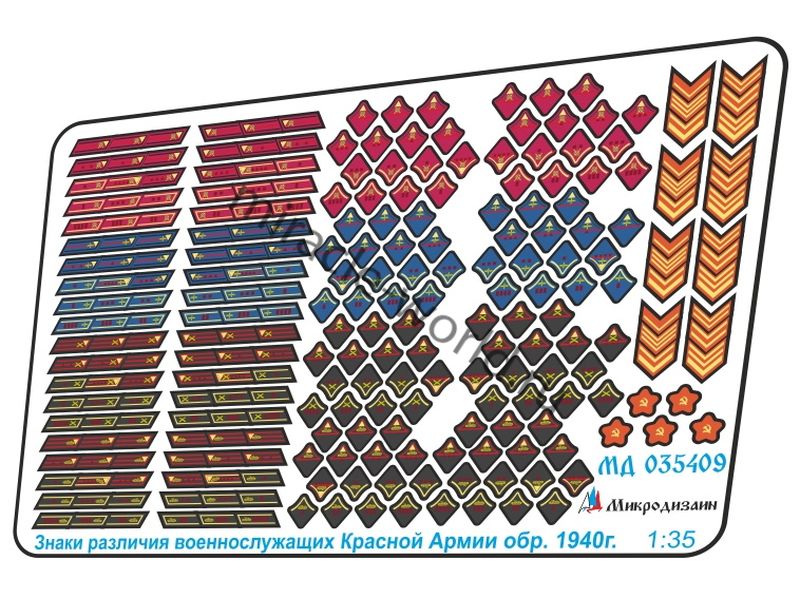 МД 035409 Набор знаков различия РККА образца 1940 года выполненных в объеме и цвете. Масштаб 1:35. Набор комплектуется 40 вариантами лычек и шевронов для различных родов войск. Набор выполнен по новой уникальной технологии.