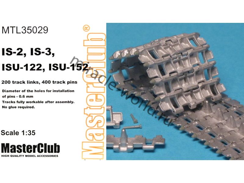 Дополнение для сборных моделей, наборные рабочие металлические траки для советских тяжелых танков и САУ: ИС-2, ИС-3, ИСУ-122, ИСУ-152 (поздние) в масштабе 1/35 от фирмы Master Club (артикул MTL35029).