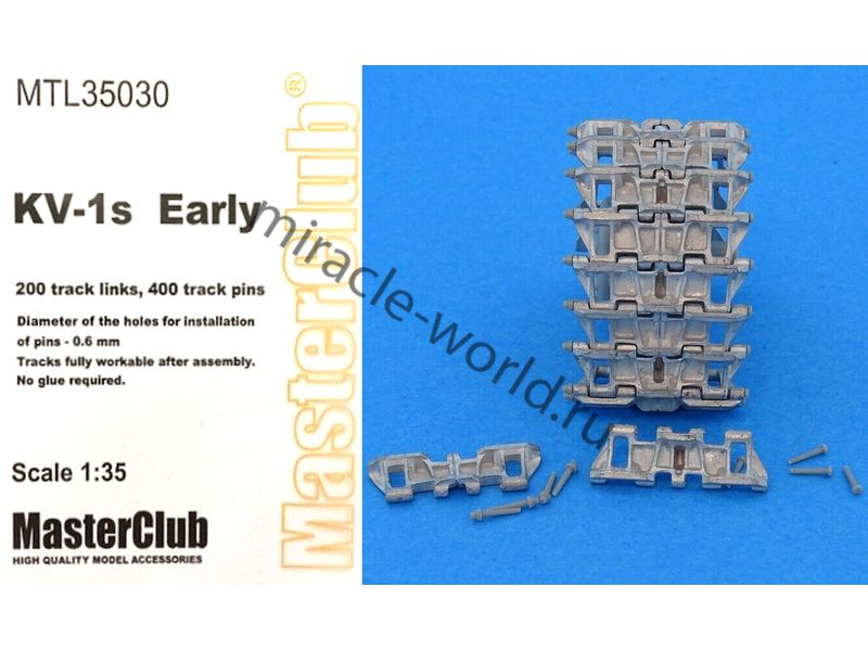 Дополнение для сборных моделей, наборные рабочие металлические траки для советских тяжелых танков: КВ-1С (ранний) в масштабе 1/35 от фирмы Master Club (артикул MTL35030).
