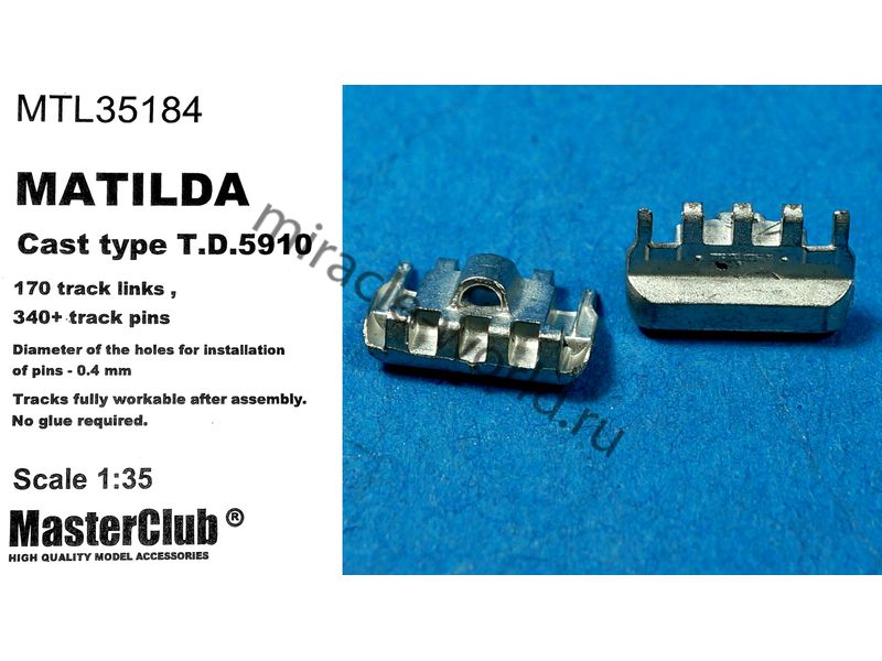 Дополнение для сборных моделей, наборные рабочие металлические траки для британских средних пехотных танков: Matilda T.D.5910 (cast type) в масштабе 1/35 от фирмы Master Club (артикул MTL35184).