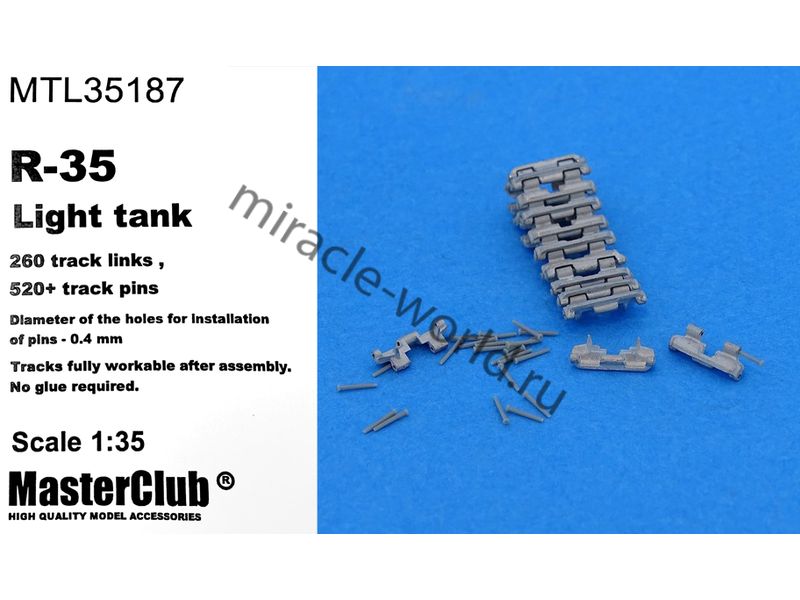 Дополнение для сборных моделей, наборные рабочие металлические траки для французских легких танков: Renault R35 / Renault R39 в масштабе 1/35 от фирмы Master Club (артикул MTL35187).