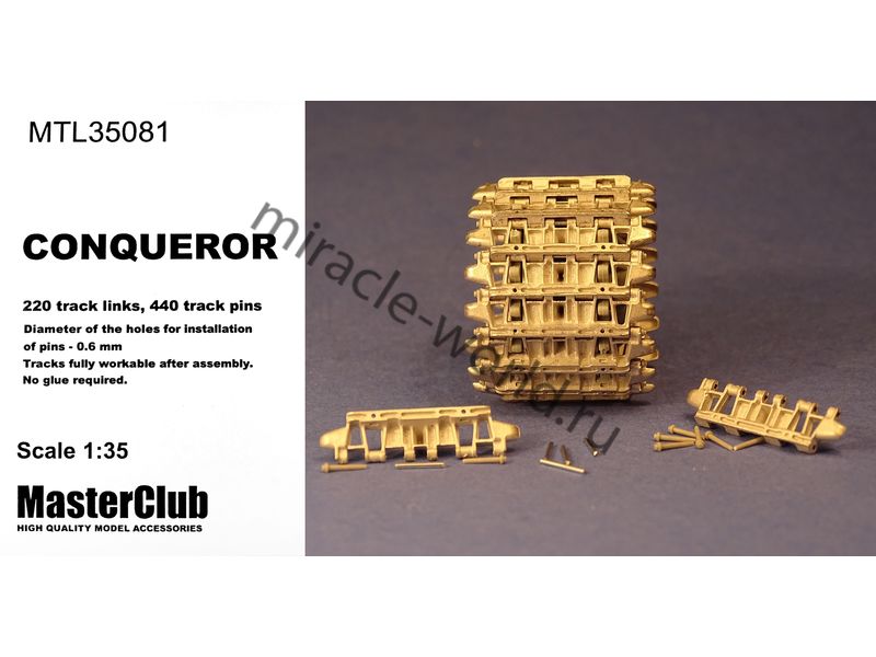 Дополнение для сборных моделей, наборные рабочие металлические траки для британских тяжелых танков: Conqueror в масштабе 1/35 от фирмы Master Club (артикул MTL35081).