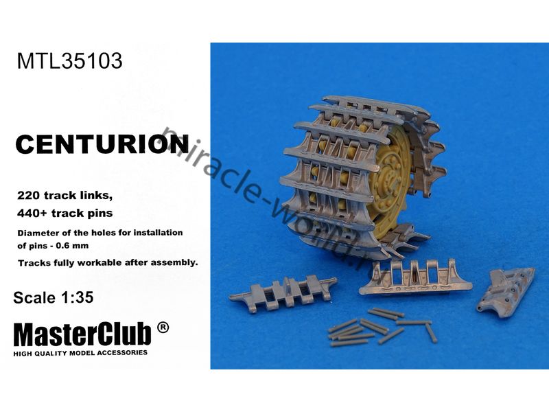 Дополнение для сборных моделей, наборные рабочие металлические траки для британских средних танков: Centurion в масштабе 1/35 от фирмы Master Club (артикул MTL35103).