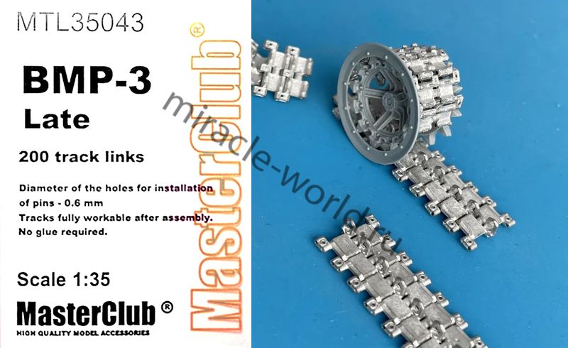 Дополнение для сборных моделей, наборные рабочие металлические траки для советских / российских боевых машин пехоты: БМП-3 (поздние) в масштабе 1/35 от фирмы Master Club (артикул MTL35043).
