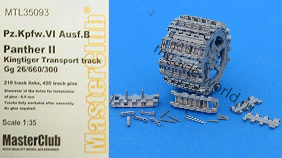 Дополнение для сборных моделей, наборные рабочие металлические траки для немецких тяжелых танков: Sd.Kfz.182 Pz.Kpfw.VI Ausf.B "King Tiger", Panther II, Transport track - Gg 26/660/300 (ранние) в масштабе 1/35 от фирмы Master Club (артикул MTL35093).